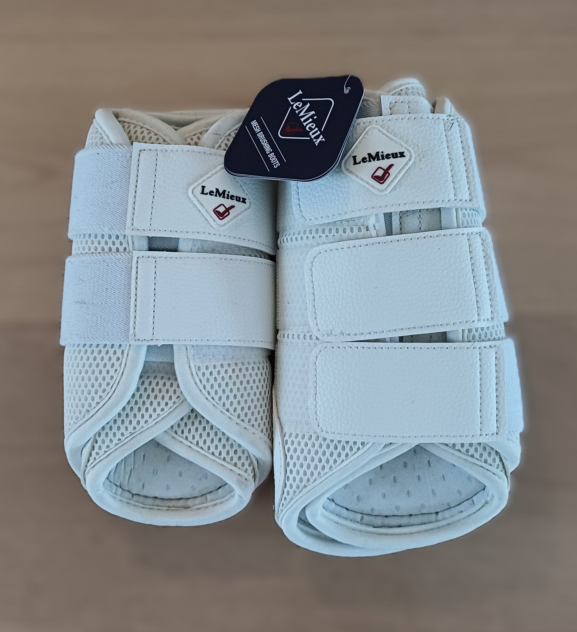 Deze LEMIEUX dressuurgaiters , in nieuwstaat en maat L , bieden optimale bescherming en maximaal comfort . Het strakke design en de klassieke witte kleur maken ze perfect voor wedstrijden of trainingen, en combineren veiligheid en stijl .
