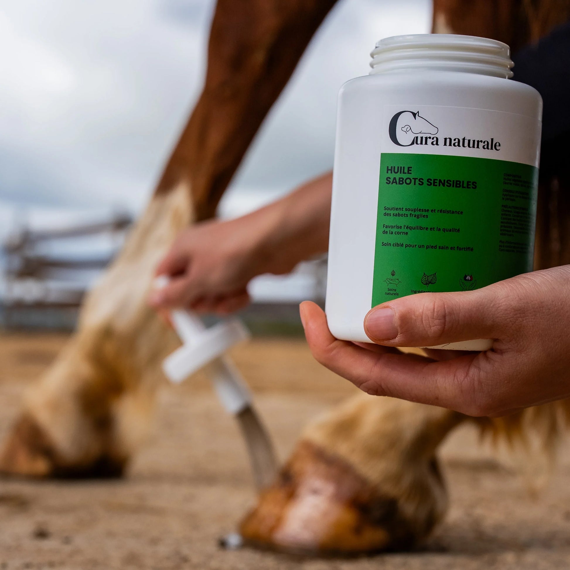 L'Huile Sabots Sensibles Cura Naturale est une solution naturelle premium spécialement formulée pour les sabots fragiles et sensibles de votre cheval.
