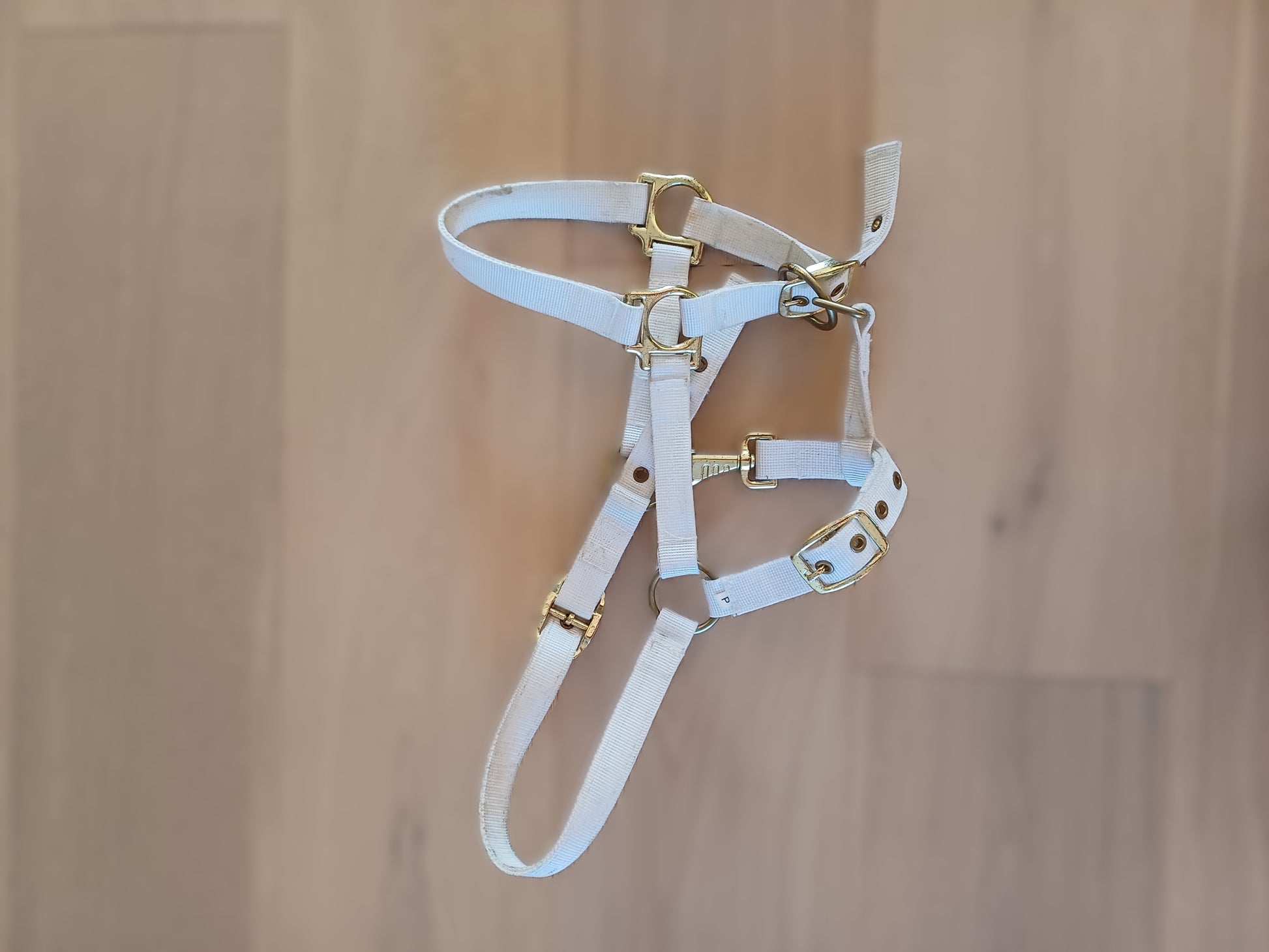 Dit witte halster, ter grootte van een veulen, is praktisch en comfortabel en ideaal voor het vastzetten, verzorgen of verplaatsen van jonge paarden.